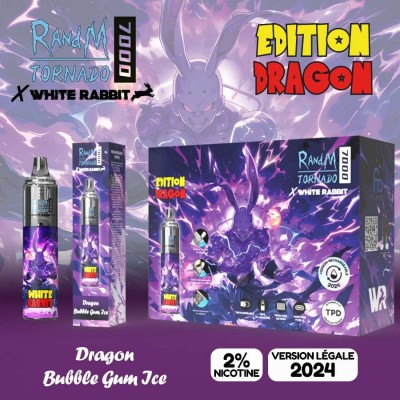 Le TORNADO 7000 Dragon Bubble Gum Ice est une puff rechargeable révolutionnaire avec 2% de nicotine, offrant jusqu'à 20000 bouffées au total. Cette collaboration White Rabbit x RandM propose une saveur unique alliant bubble gum sucré, fruit du dragon exotique et fraîcheur glacée. Rechargeable en e-liquide et batterie, ce dispositif élégant avec éclairage LED combine innovation, économie et respect de l'environnement pour une expérience de vapotage exceptionnelle et durable.
