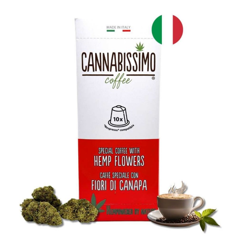 Découvrez une expérience café unique avec le Cannabissimo aux fleurs de chanvre, directement importé d'Italie. Ce mélange innovant combine 90% de café premium avec 10% de fleurs de chanvre soigneusement sélectionnées. Disponible en pack de 10 capsules compatibles Nespresso, il offre l'arôme intense du café italien enrichi des notes douces et herbacées du chanvre pour un moment de détente authentique à chaque tasse.