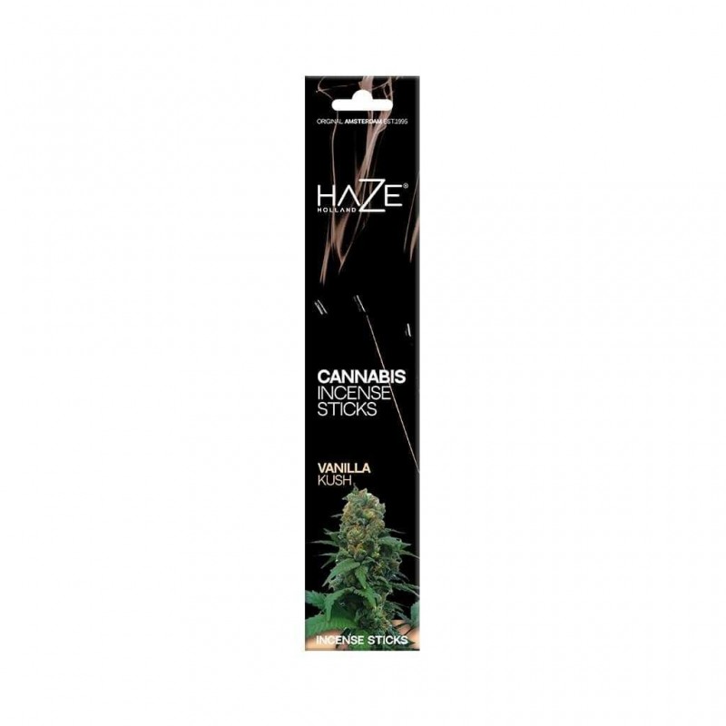 Ce paquet contient 15 bâtonnets d'encens Cannabis Vanilla Kush de la marque Haze, soigneusement parfumés pour une expérience olfactive unique.