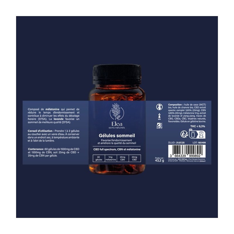 Les gélules CBD sommeil ELEA représentent une approche innovante pour retrouver un sommeil de qualité grâce à une formule synergique d'actifs naturels. Cette composition unique associe le pouvoir du CBD full spectrum, de la mélatonine, de la lavande et de l'ylang-ylang pour favoriser l'endormissement et améliorer la qualité du repos nocturne. Chaque gélule contient 25mg de CBD et 25mg de CBN, extraits par procédé CO2 supercritique garantissant une pureté optimale sans résidus. La production française et l'utilisation d'ingrédients biologiques font de ce produit une référence en matière de compléments sommeil naturels.