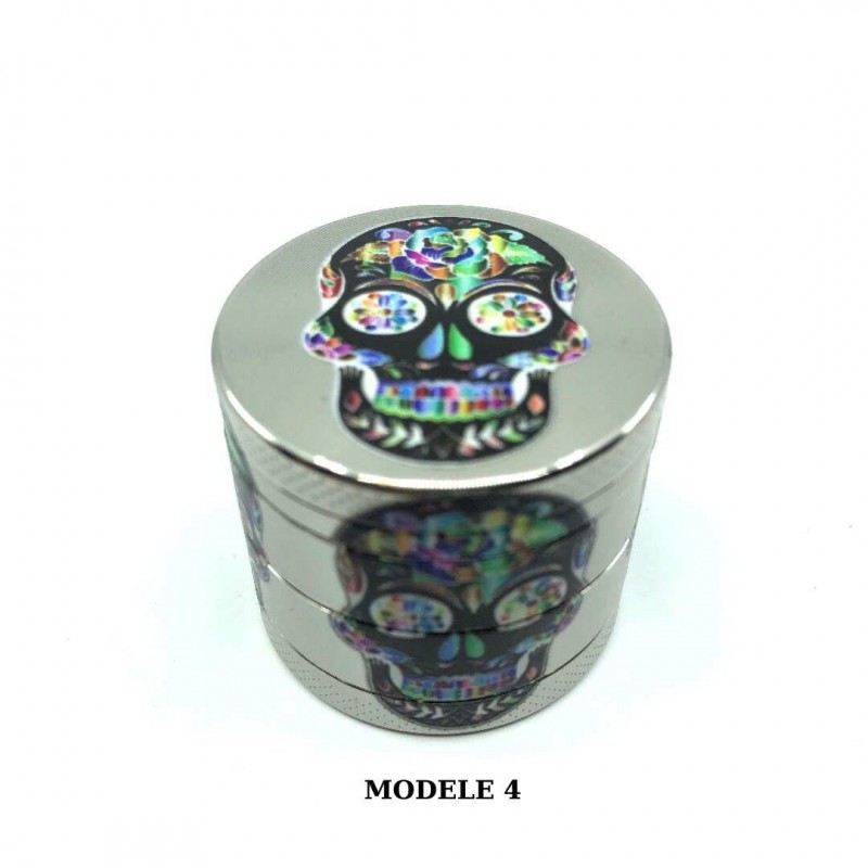 Ce grinder se distingue par sa qualité de fabrication et son design soigné. Chaque modèle présente des variations esthétiques dans les motifs de têtes de mort, permettant à chaque utilisateur de trouver son style. La structure 4 parties optimise l'expérience d'utilisation : les dents supérieures et inférieures assurent un broyage homogène, le tamis sépare efficacement les particules fines, et le récupérateur de pollen avec sa raclette permet de collecter les précieux cristaux pour une utilisation ultérieure.