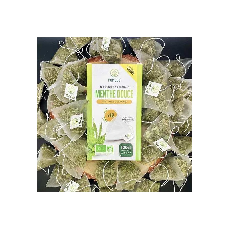 Découvrez la tisane CBD bio menthe douce de POP CBD, une infusion rafraîchissante alliant 70% de chanvre bio à la menthe verte et poivrée. Fabriquée au Luxembourg selon les standards de l'agriculture biologique, cette boîte de 12 sachets pyramide biodégradables offre une expérience gustative unique. Chaque sachet de 22g permet de préparer environ 250ml d'infusion aux propriétés antispasmodiques et décongestionnantes reconnues.