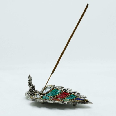 Plongez dans l'univers mystique du bouddhisme tibétain avec ce magnifique porte-encens feuille de Bouddha. Confectionné artisanalement en Inde, ce support d'encens allie spiritualité et esthétique raffinée. Ses couleurs rouge, bleu profond et turquoise rehaussées de détails métalliques créent une atmosphère de sérénité parfaite pour vos moments de méditation et la décoration de votre espace sacré personnel.