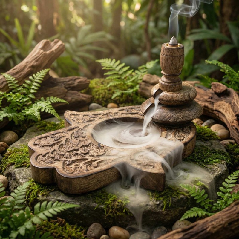 Transformez vos moments de relaxation avec ce magnifique brûleur à reflux en bois de manguier orné du motif Hamsa protecteur. Sa technologie révolutionnaire crée un effet cascade de fumée spectaculaire qui descend en douceur, offrant un spectacle visuel hypnotique. Fabriqué artisanalement dans un bois noble aux veines naturelles uniques, ce brûleur de dimensions 13x23x22 cm apporte une dimension spirituelle authentique à votre intérieur tout en facilitant vos séances de méditation quotidiennes.
