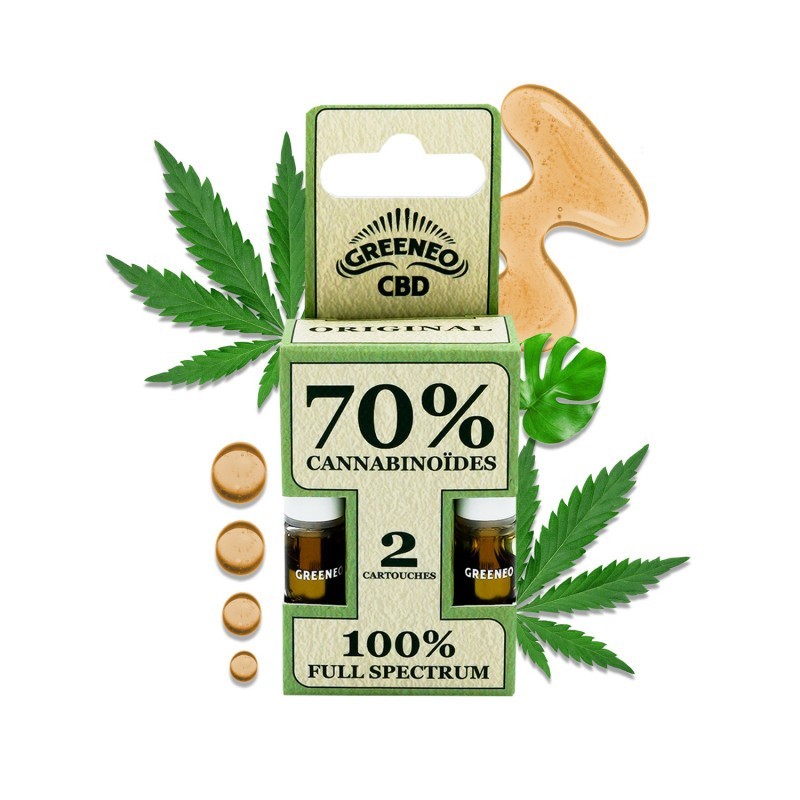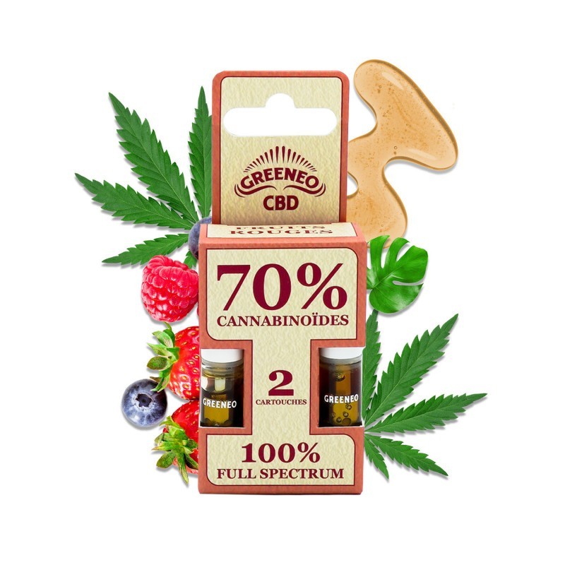 Découvrez les cartouches CBD Full Spectrum 70% de Greeneo, un concentré exceptionnel de cannabinoïdes avec 52% de CBD pur. Ce pack de 2 cartouches sans nicotine vous offre une expérience de vapotage intense grâce à l'effet d'entourage. Disponibles en 4 saveurs délicieuses : fruits rouges, menthe, chanvre naturel et tutti frutti. Compatible exclusivement avec les sticks CBD Greeneo pour une utilisation optimale et pratique.